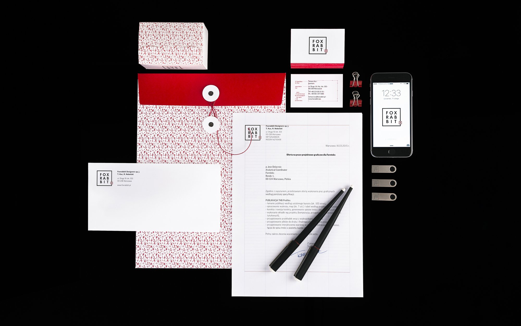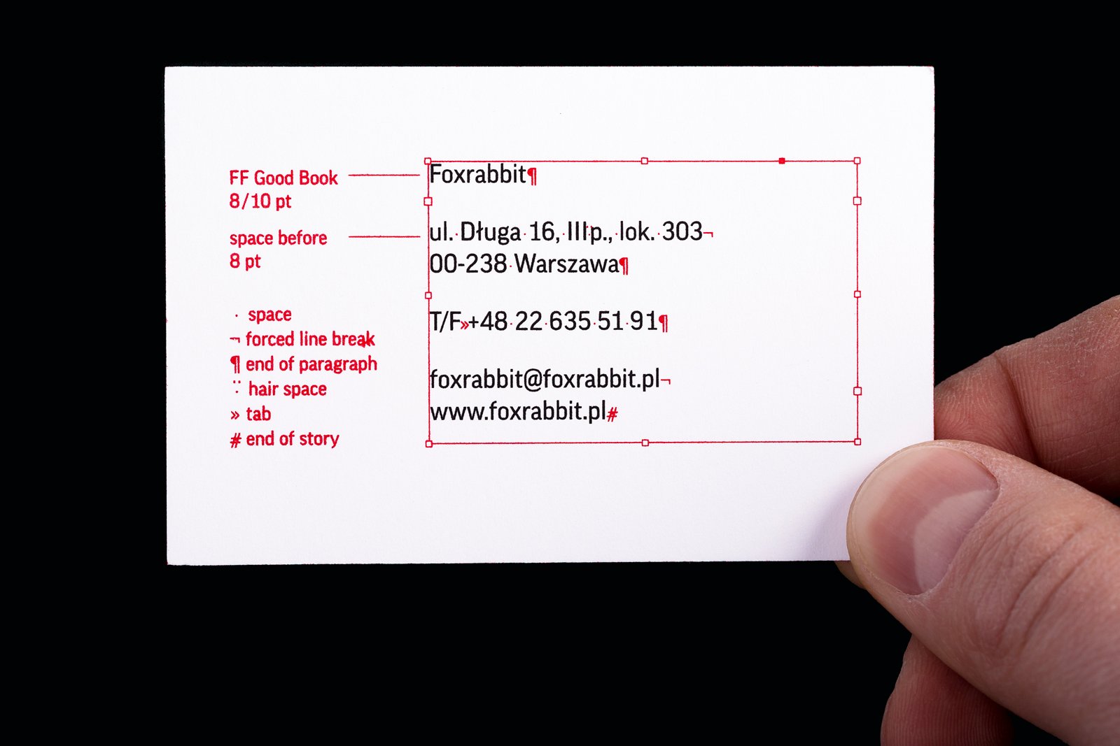 Foxrabbit Designers is a Warsaw-based DTP and graphic design studio that I was part of for over 5 years. After many years of working together, my partners and I decided to change the company logo and produce some well-branded stationery. We decided to keep Futura as our font on account of the transparent look of its letters. Our goal was to have a clean typographic sign with only 'Foxrabbit' in our logo. After putting it in a square frame, I decided to add the Adobe InDesign red plus symbol that indicates overset text. Our overset text was 'designers'. I also thought that the red cross would be a good reference to Swiss typography.