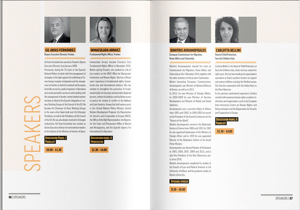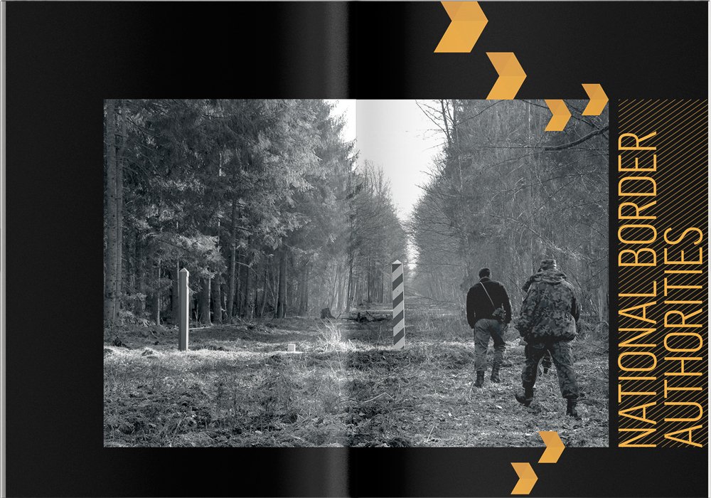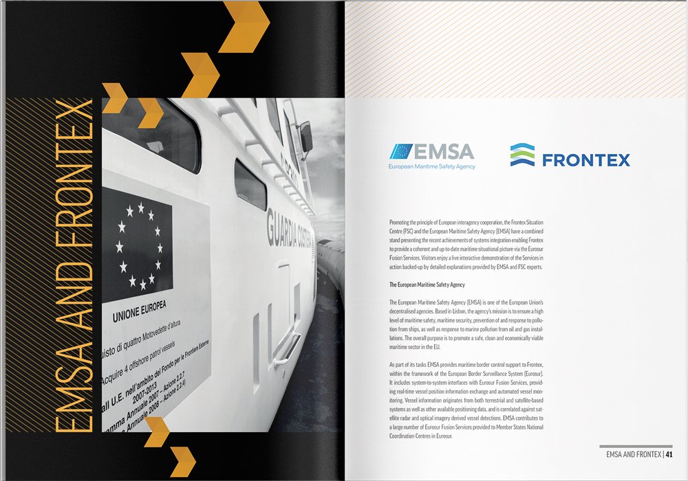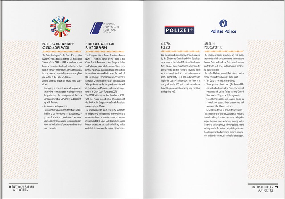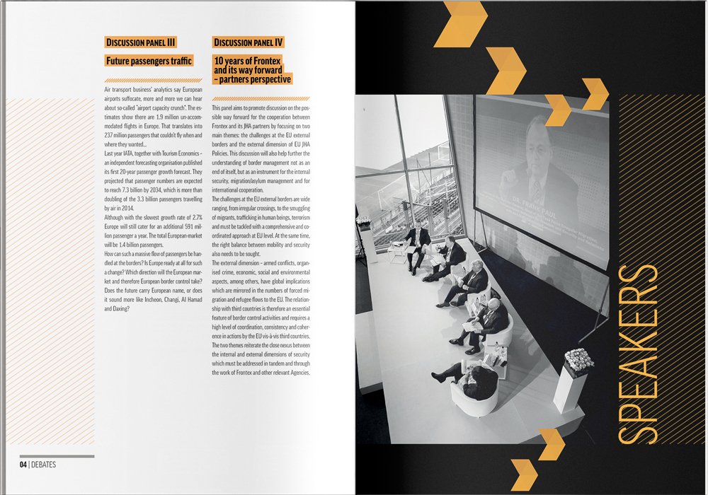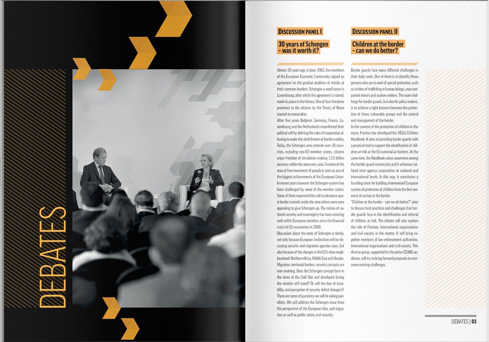 In 2015, Frontex returned to us to design the brochure for the European Day for Border Guards (ED4BG) conference. However, this time around we had a more reasonable deadline. We decided to use smaller B5 format and create a cover with wings. The front cover was folded outside so we could place a conference programme on it. The back cover was folded inside and contained the map.