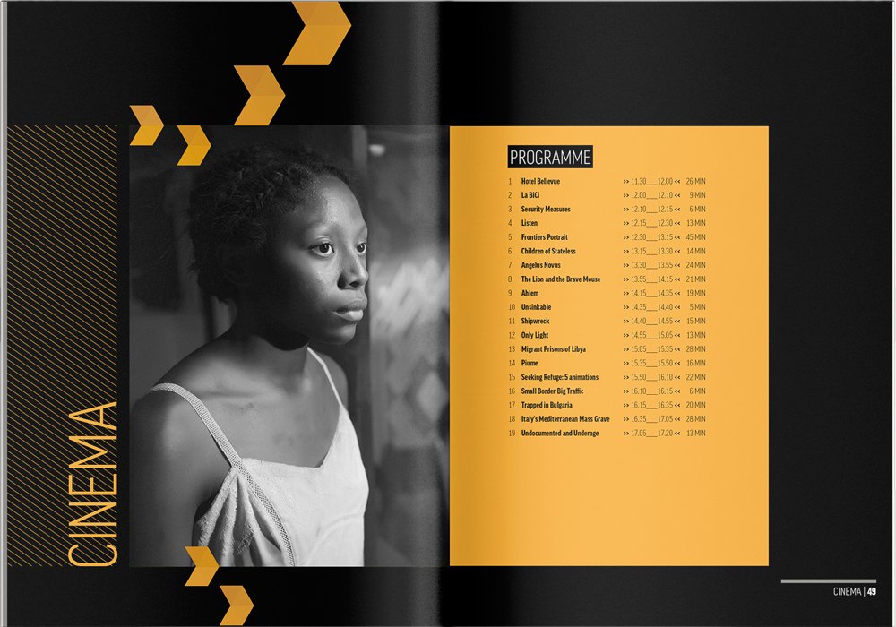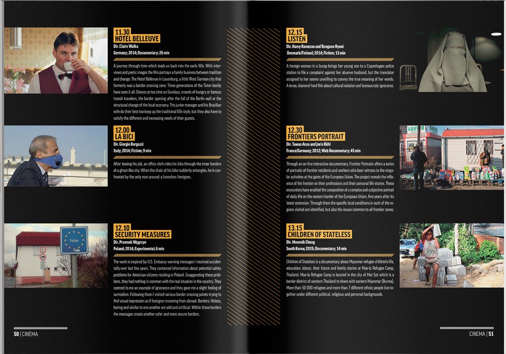 The whole text was set in FF Good Condensed. I designed a pattern with golden yellow triangles that I used on the cover with additional materials. The challenge here was to prepare the brochure for print as really thin yellow lines on a black background are quite risky. Thanks to the excellent prepress skills of a colleague, Tomasz Kuc, printery was able to produce it and the effects were spectacular.